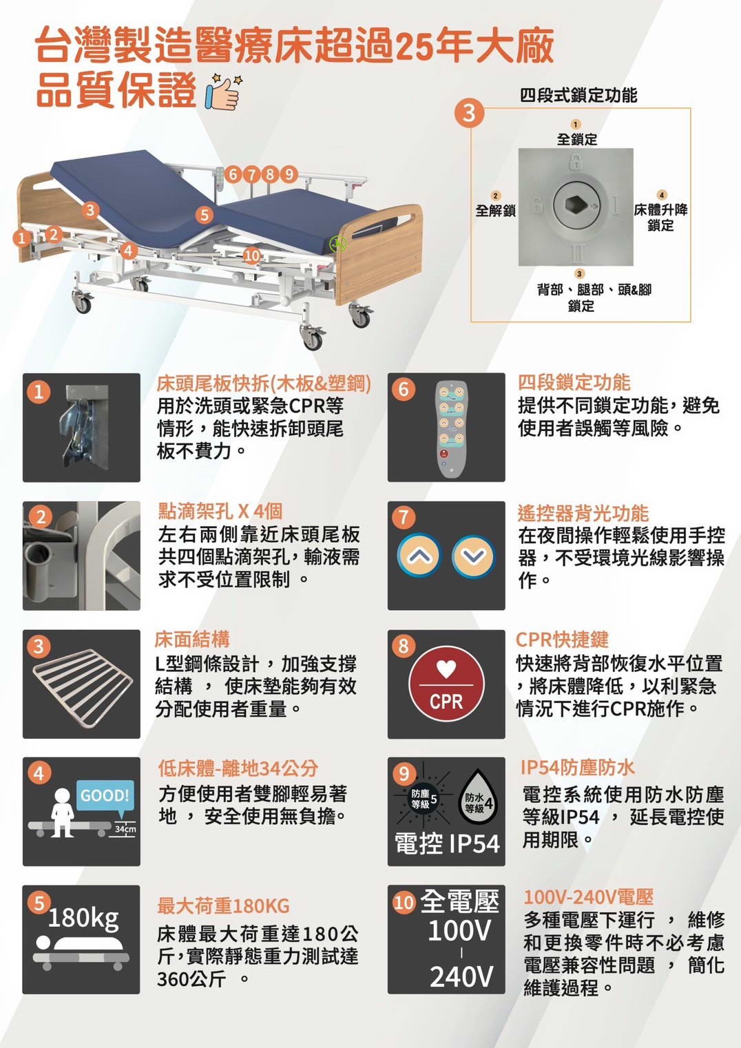 - 床體昇降:34 ~ 65 cm