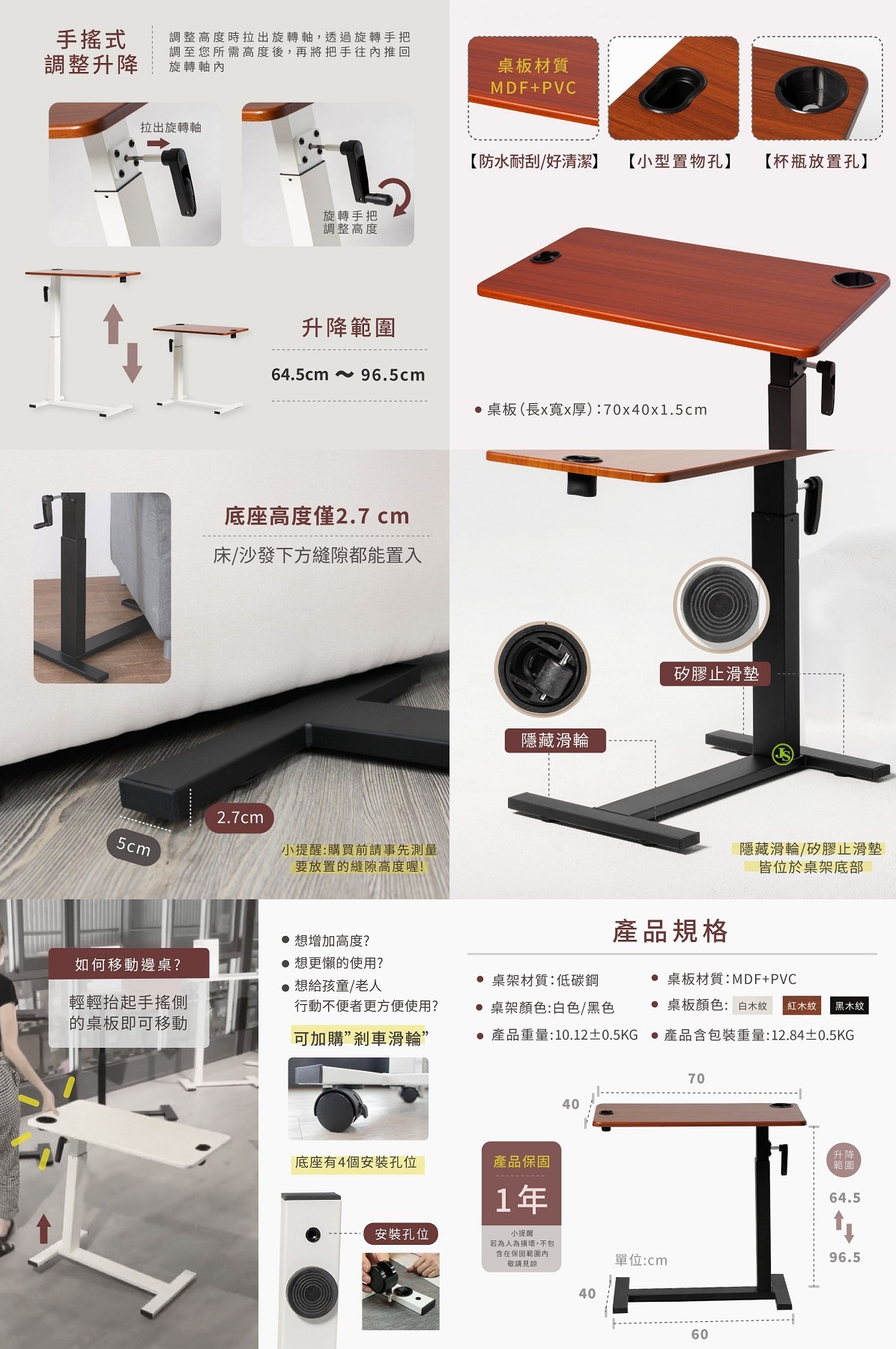 隱藏滾輪手搖升降床邊桌(六色新款))#人氣商品