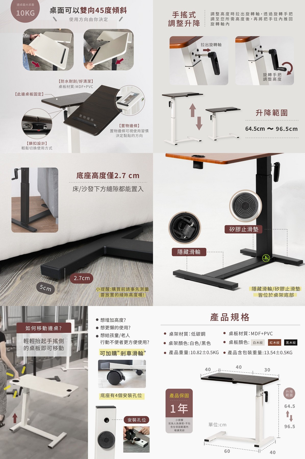 桌板可傾斜45度隱藏滾輪手搖升降床邊桌(六色新款))#人氣商品