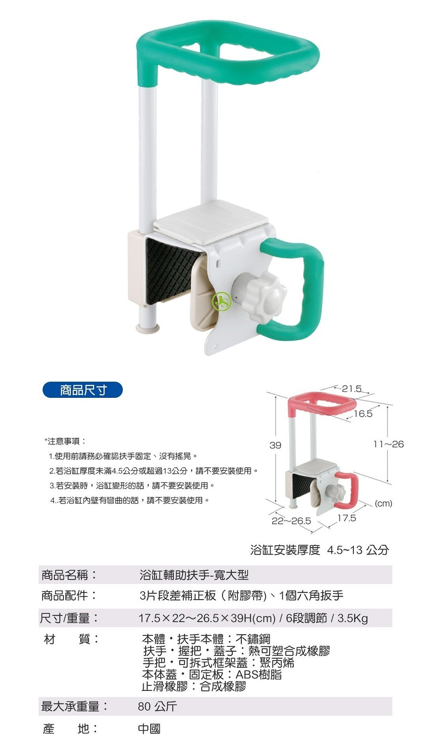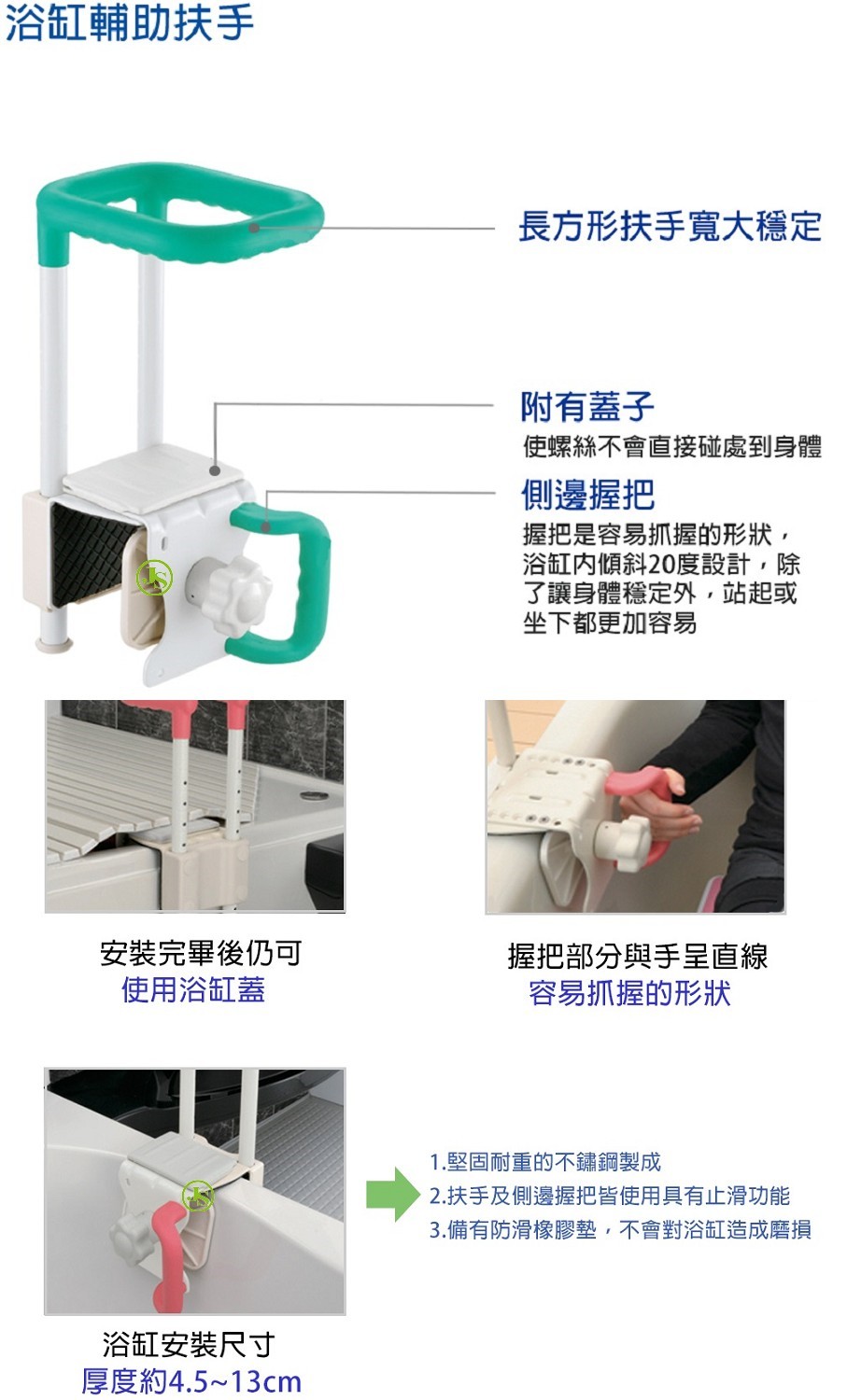 - 可雙手握住把手,身體不易傾斜,安穩的跨入浴缸內