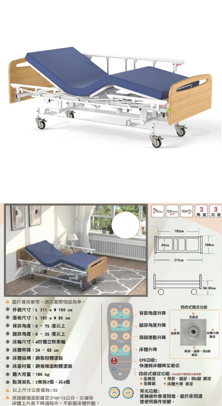 - 床體昇降:34 ~ 65 cm