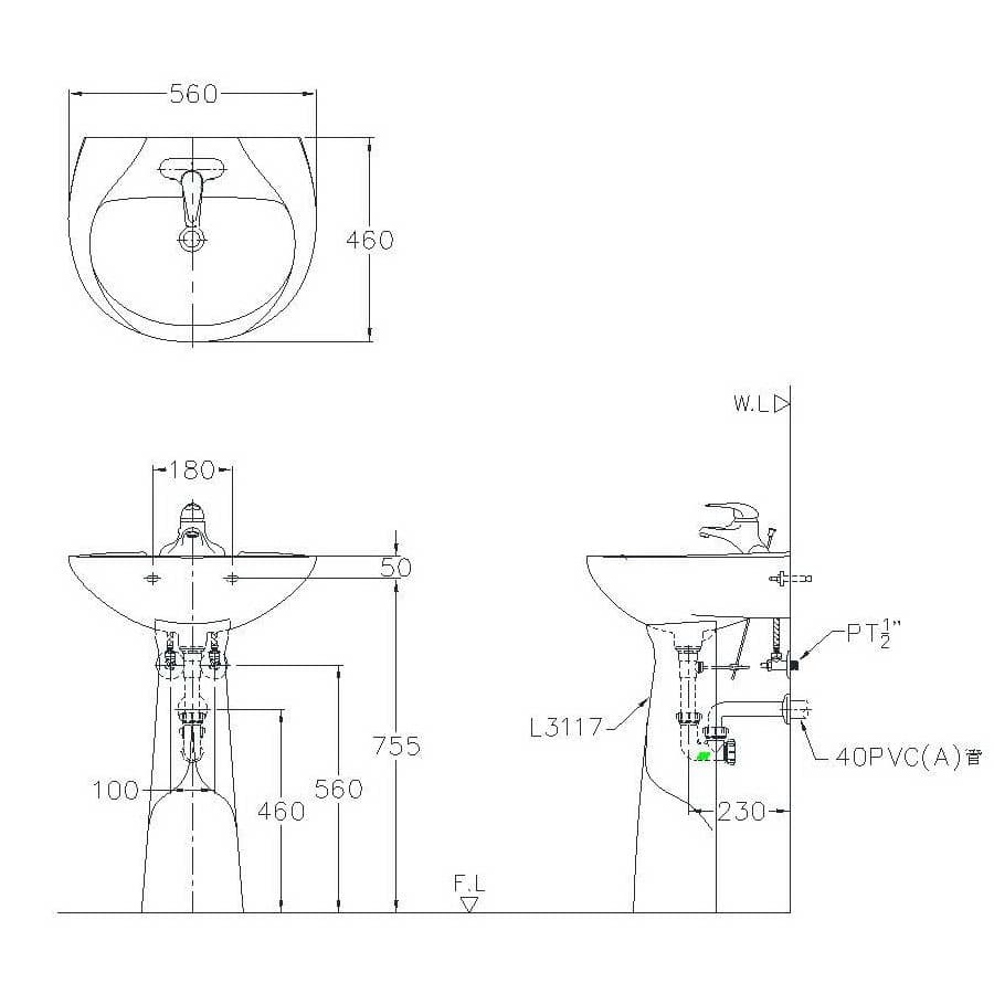 - 面盆:W 560 x D 460 x H 215 mm