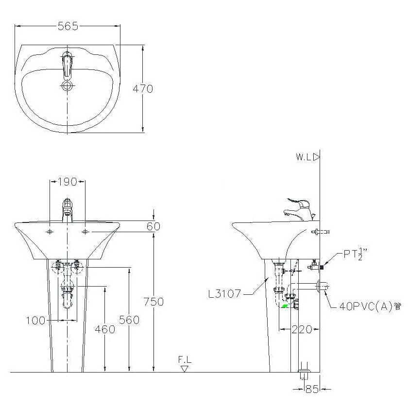 - 面盆:W 565 x D 470 x H 225 mm