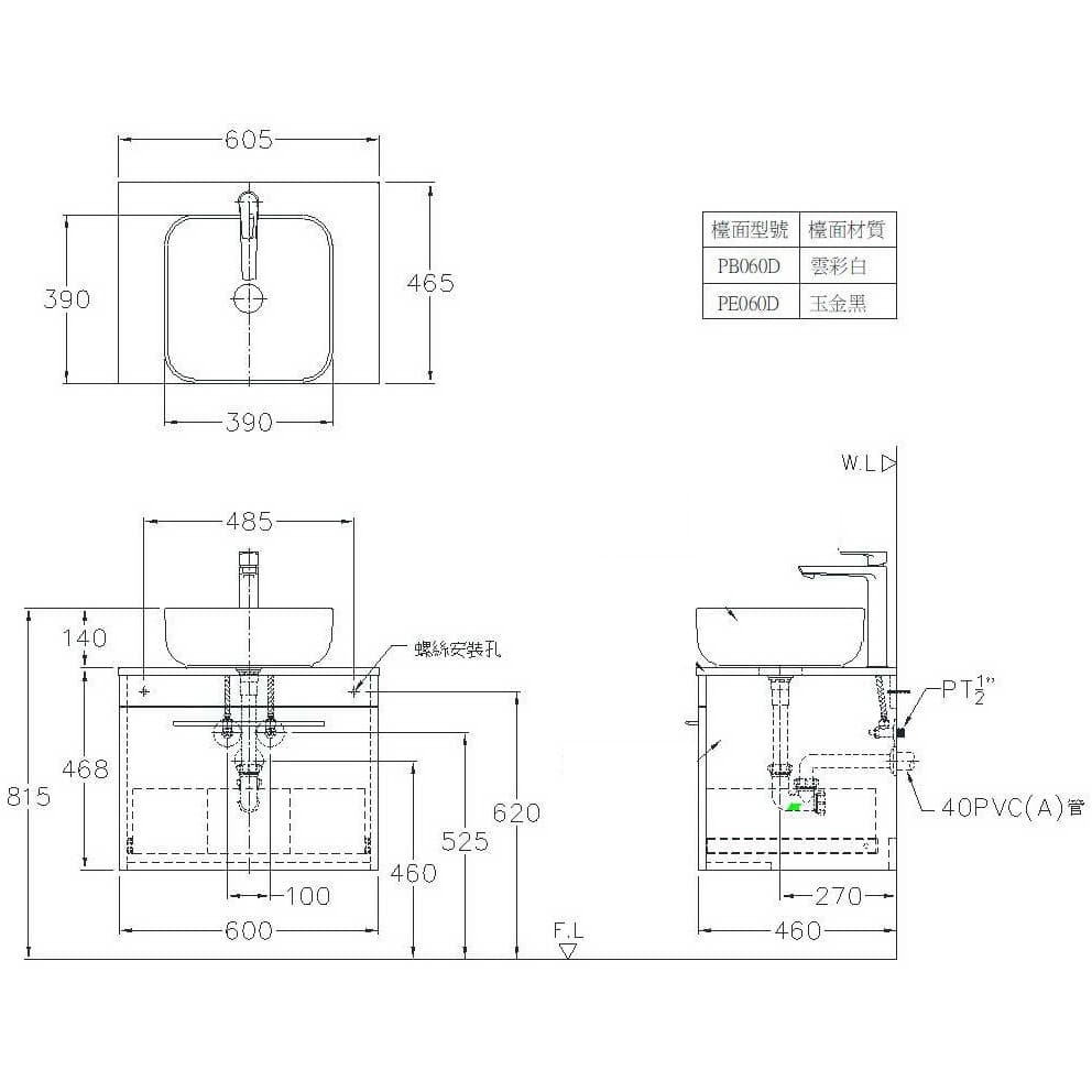 - 掛式浴櫃:W 600 x D 460 x H 450 mm