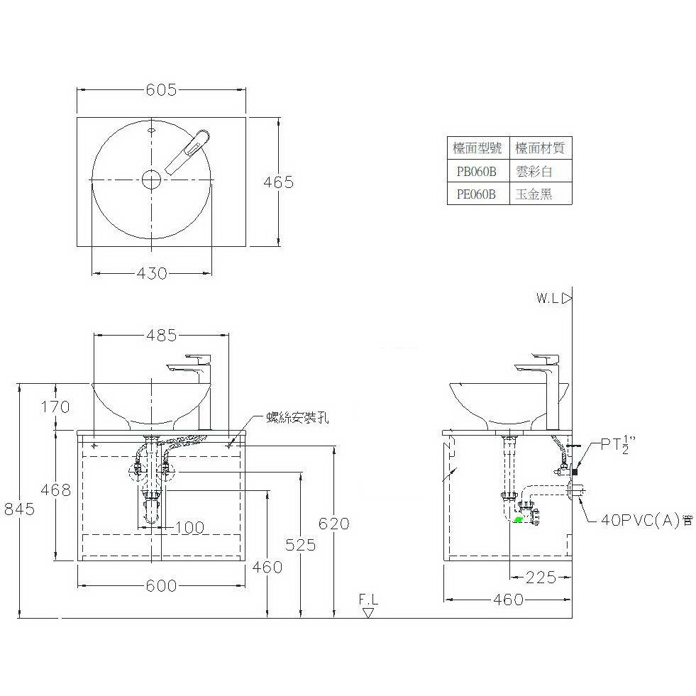 - 1.浴櫃材質:PVC實心發泡板、木紋貼皮