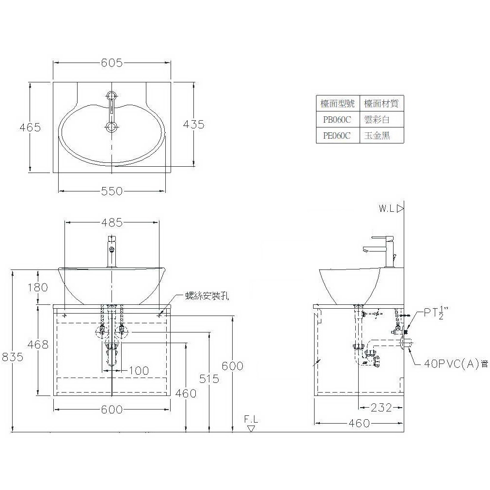 - 掛式浴櫃:W 600 x D 460 x H 450 mm