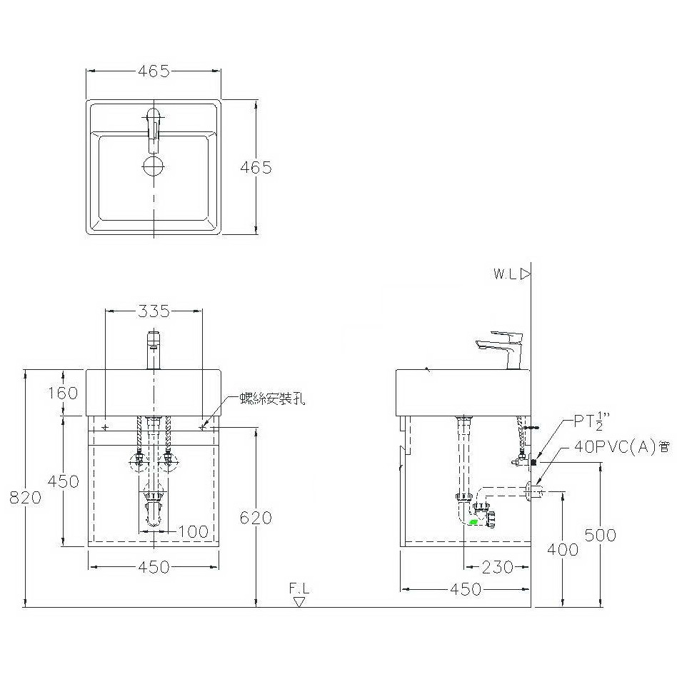 - 掛式浴櫃:W 450 x D 450 x H 450 mm