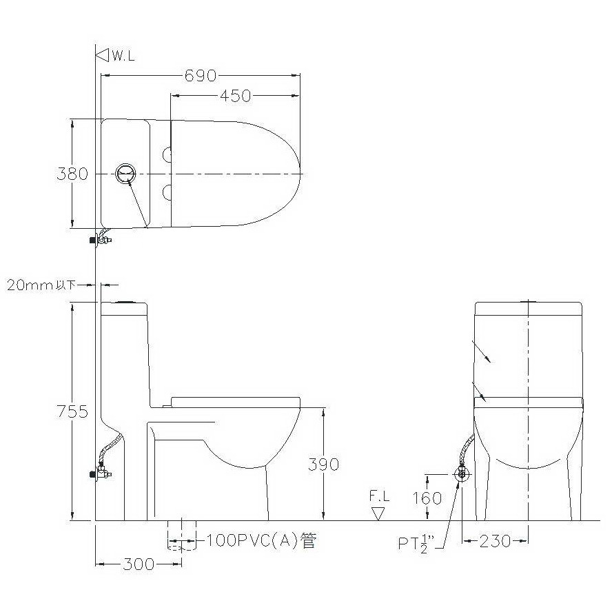 - 單體奈米馬桶:W 380 x D 690 X H 755 mm