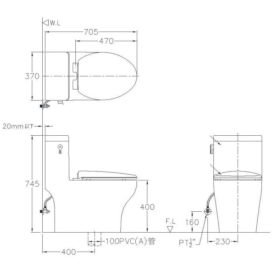 - 單體馬桶:W 370 x D 705 X H 745 mm
