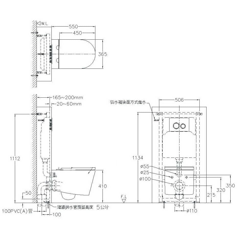 - 馬桶(掛式):W 365 x D550 x H 370 mm