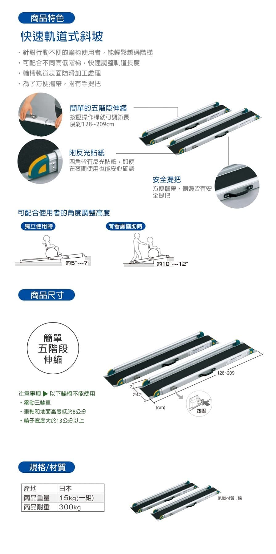 日本製五段可攜帶軌道型非固定式斜坡128~209cm(新款)