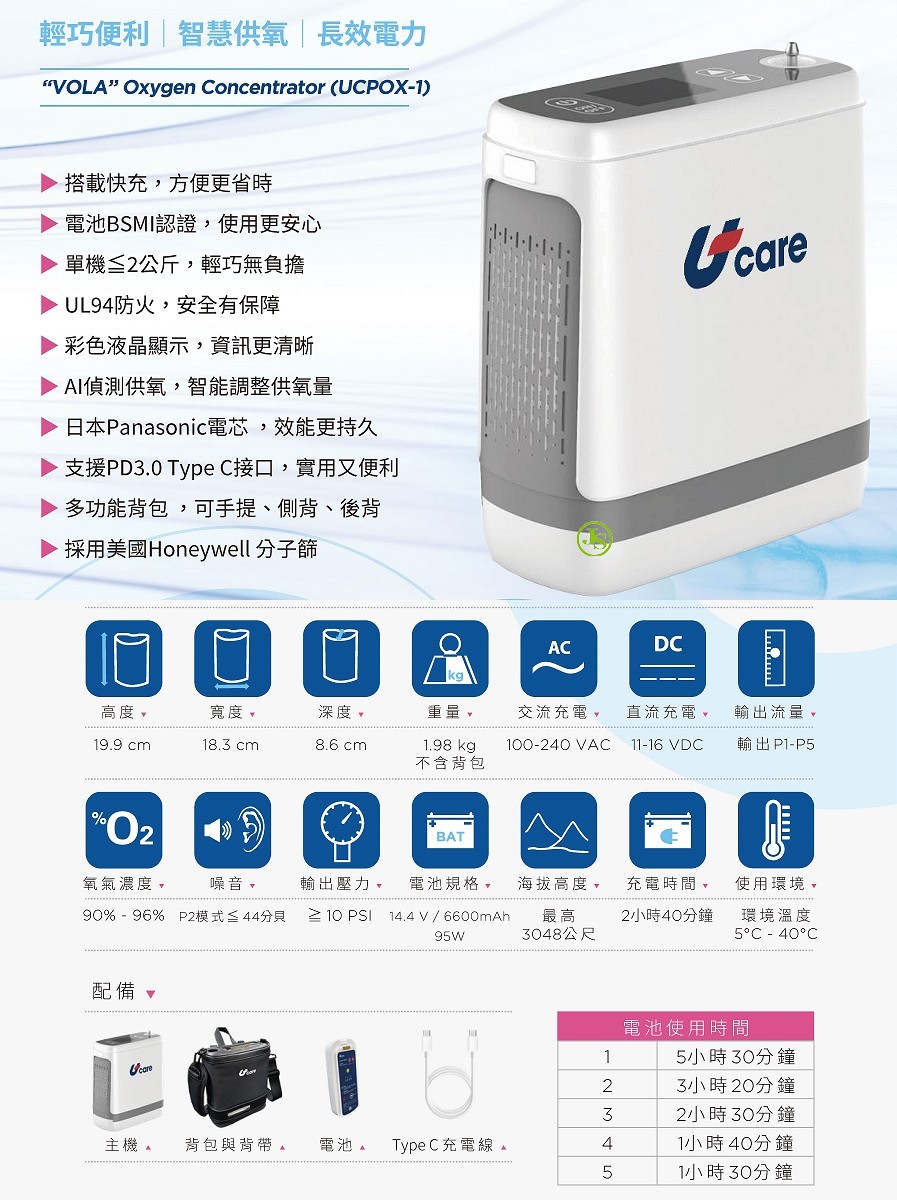 - 輕巧便利 智慧供氧 長效電力