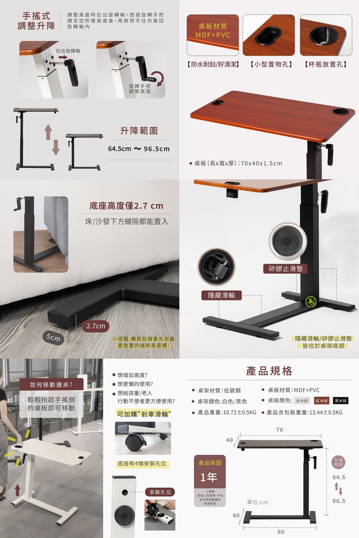 桌面可180度旋轉隱藏滾輪手搖升降床邊桌(六色新款))#人氣商品